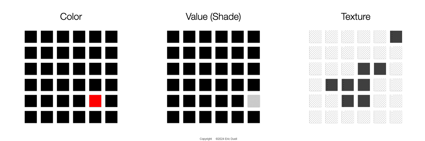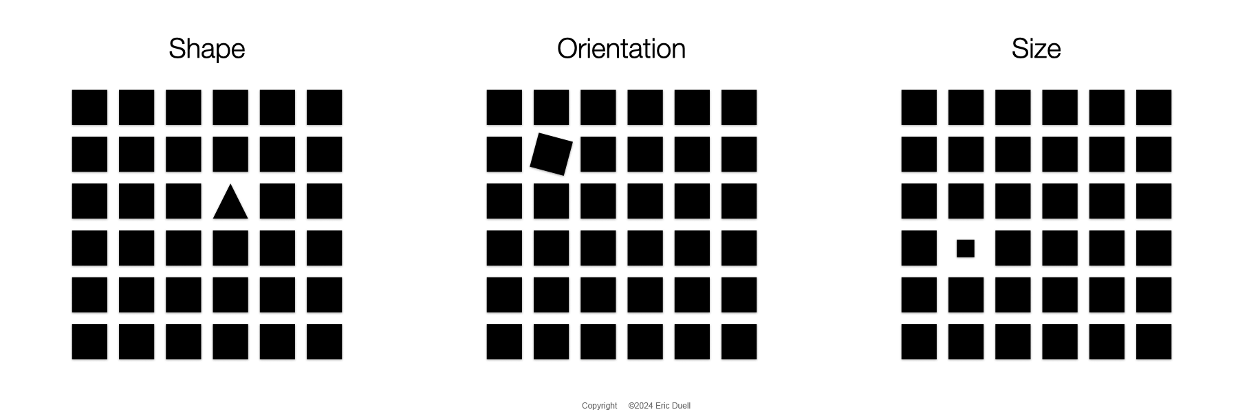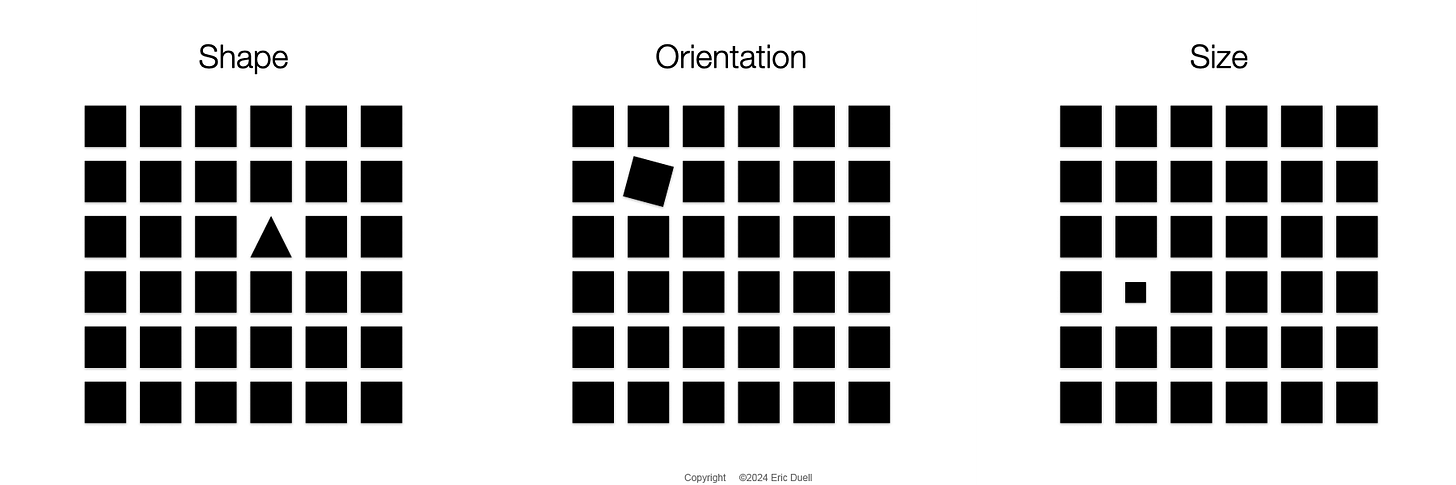 These visual attributes are pre-attentive—we notice them without actively thinking about what we’re seeing. Our perception is highly attuned to notice differences in these attributes within a set, and these differences automatically activate our attention.