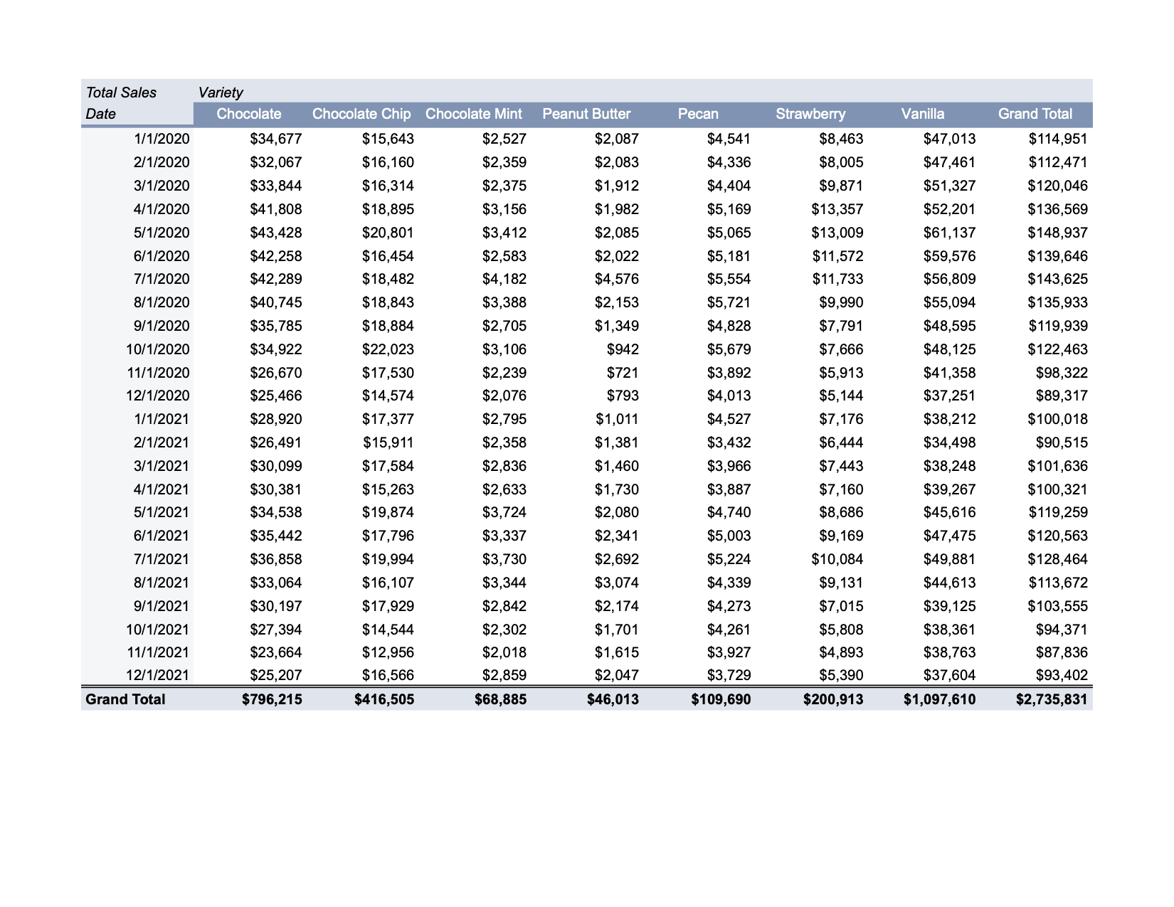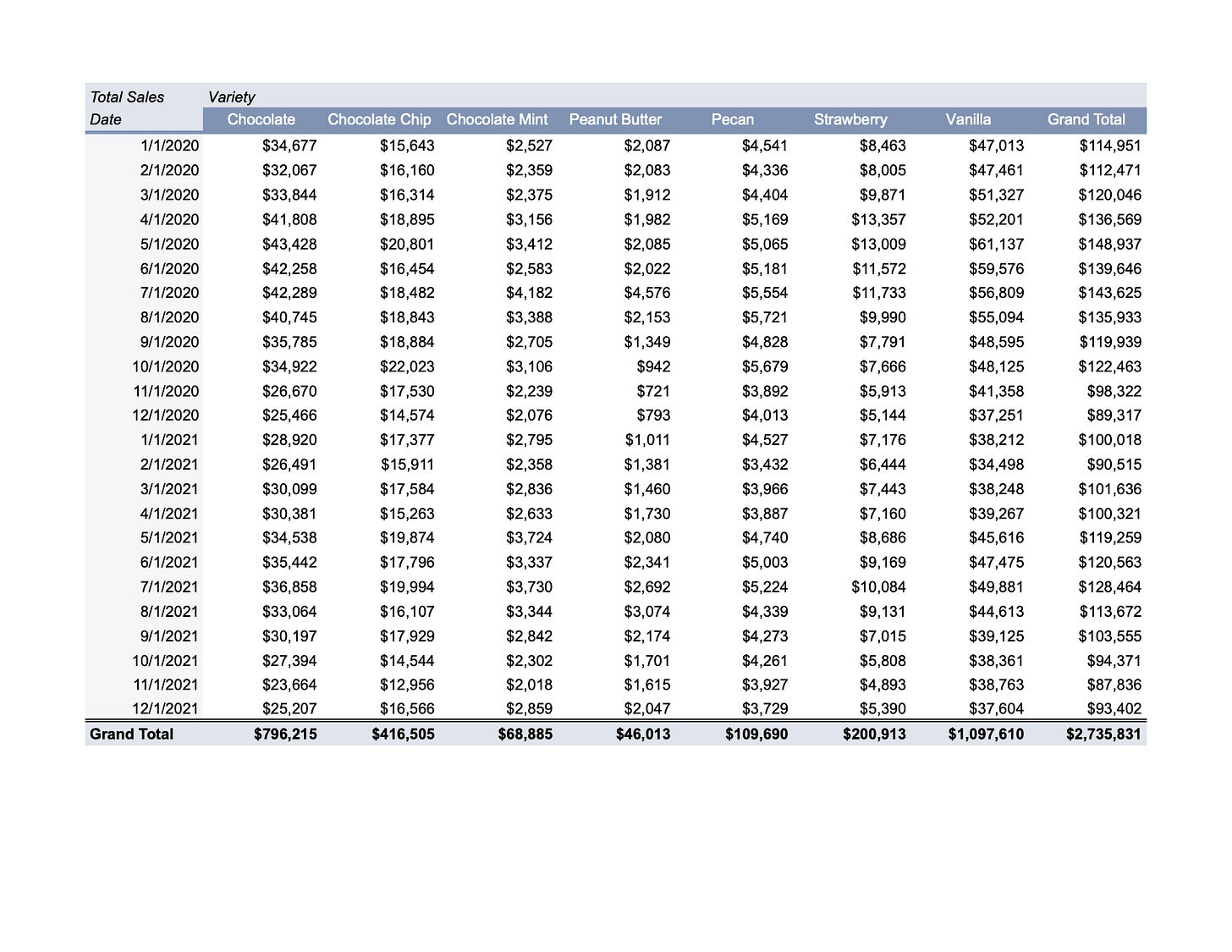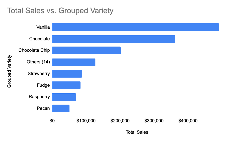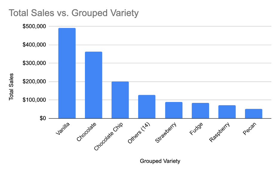 Do we get most of our sales from a small number of varieties or are sales equally distributed? Most sales come from a few top sellers: Vanilla, chocolate, and chocolate chip. The 14 varieties with the lowest sales, when all combined, still don’t measure up to those top three.