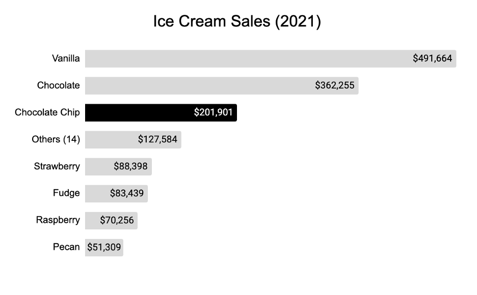 In what may seem like a counterintuitive choice at first, I made all but one of the bars grey, because I wanted to focus your attention on Chocolate Chip. By making the Chocolate Chip bar a different value and with more visual weight than the rest, you can’t not see it.