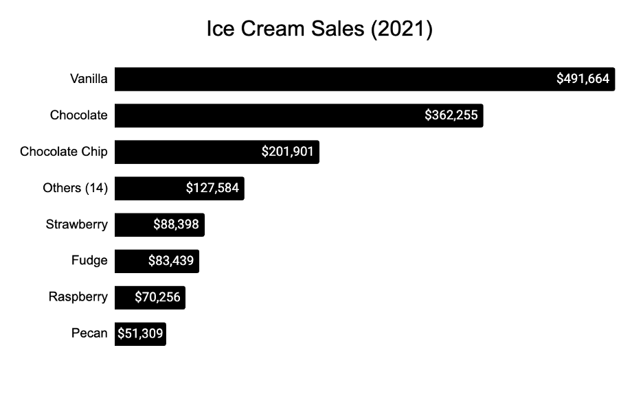 In the chart above, I applied order to rank the sales by variety—and true to form, vanilla reigns supreme in the GOT Ice Cream data set just like in real life. But this is just the start of making the visualization more effective, and instead of adding more toppings to our sundae, I’ll start with taking things away.