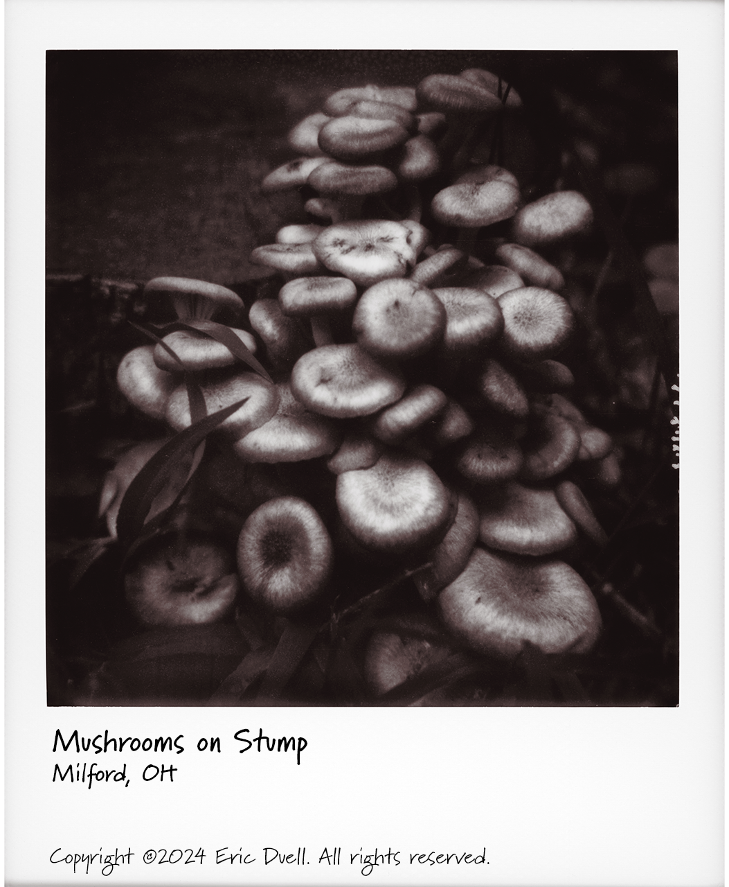 One of the things I appreciate about nature is that it knows what it is intuitively — no need to explain — like this cluster of mushrooms on a stump. I appreciate its form so elegantly revealed in this photograph. Taken with my Polaroid SX-70 (MiNT SLR670-X) with Polaroid B&W Film.